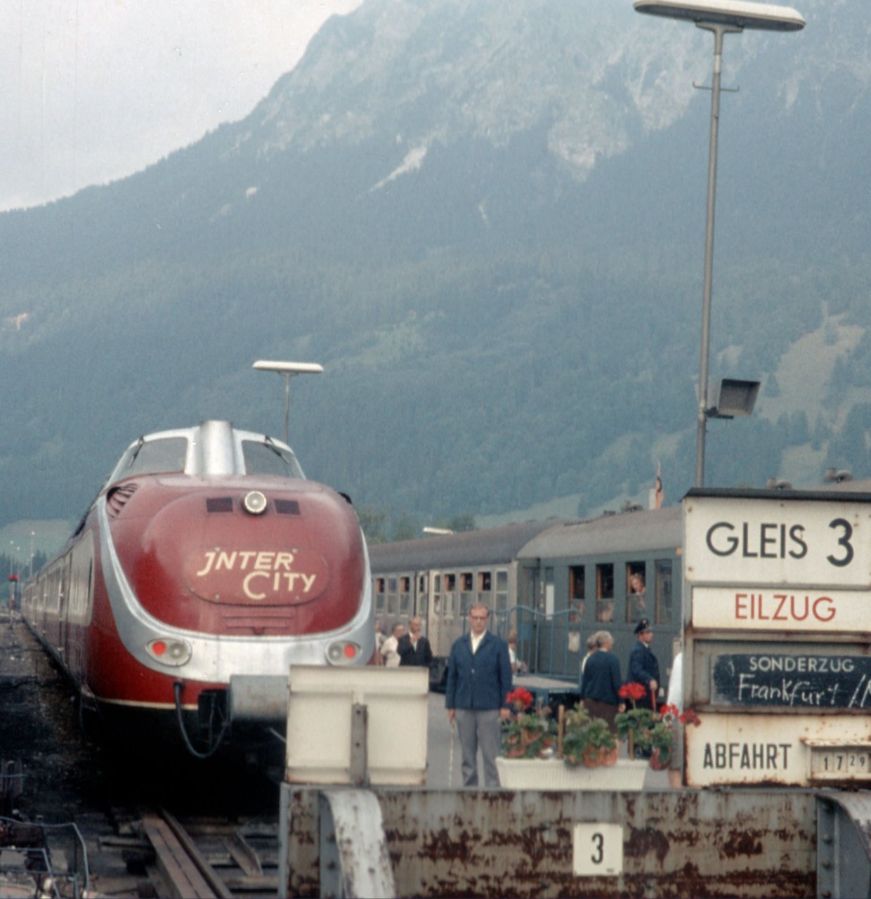 601-Sonderzug steht im Jahr 1970 in Oberstdorf zur Fahrt nach Frankfurt/Main